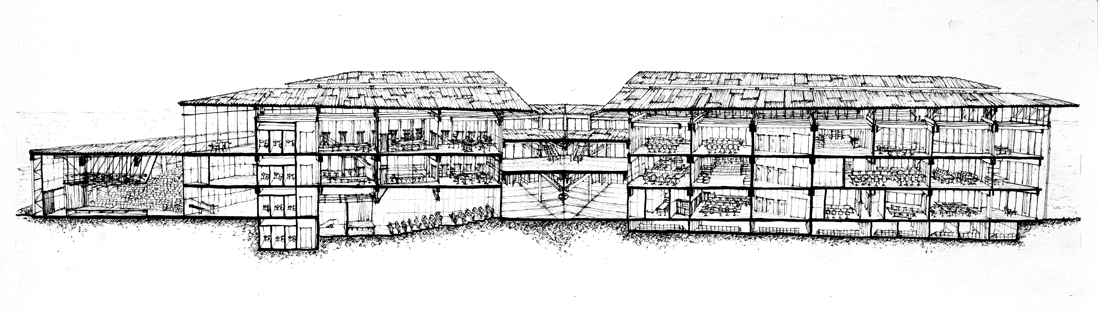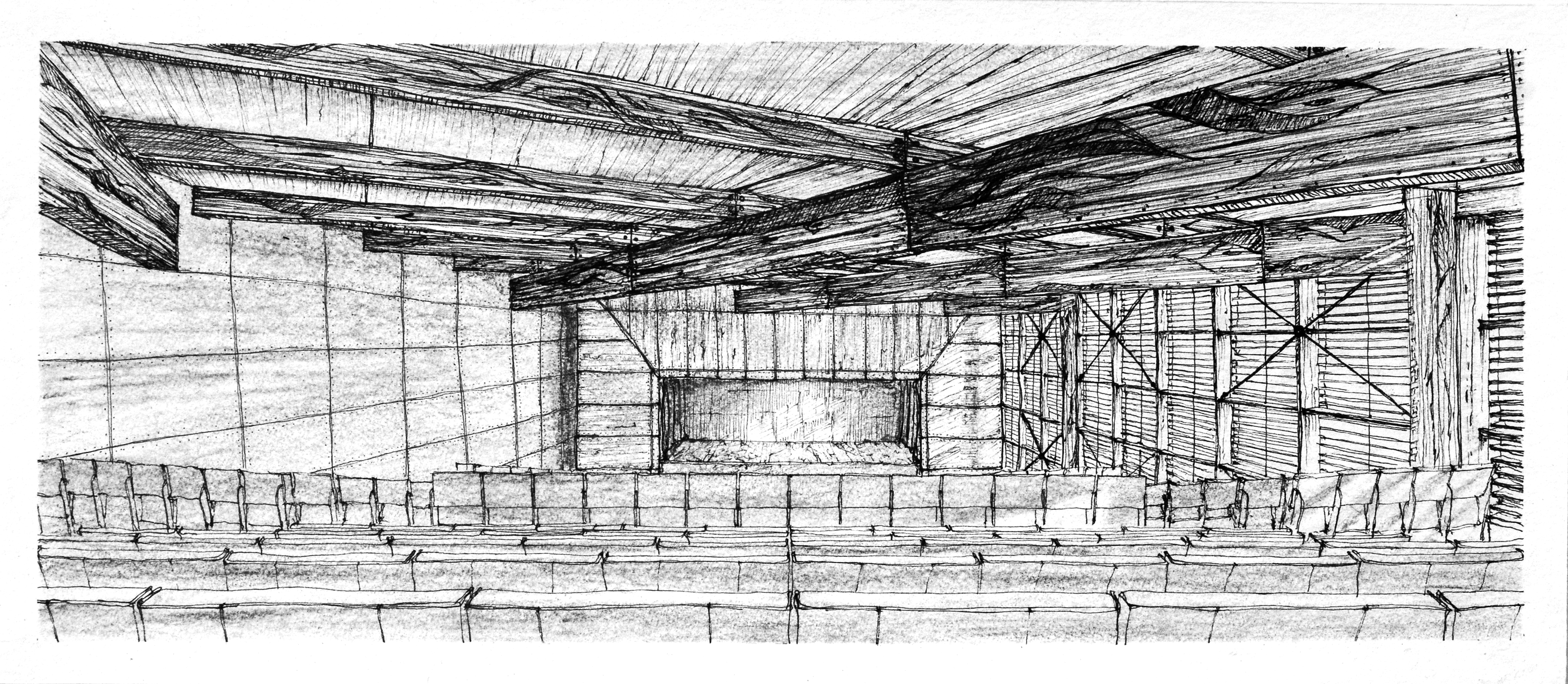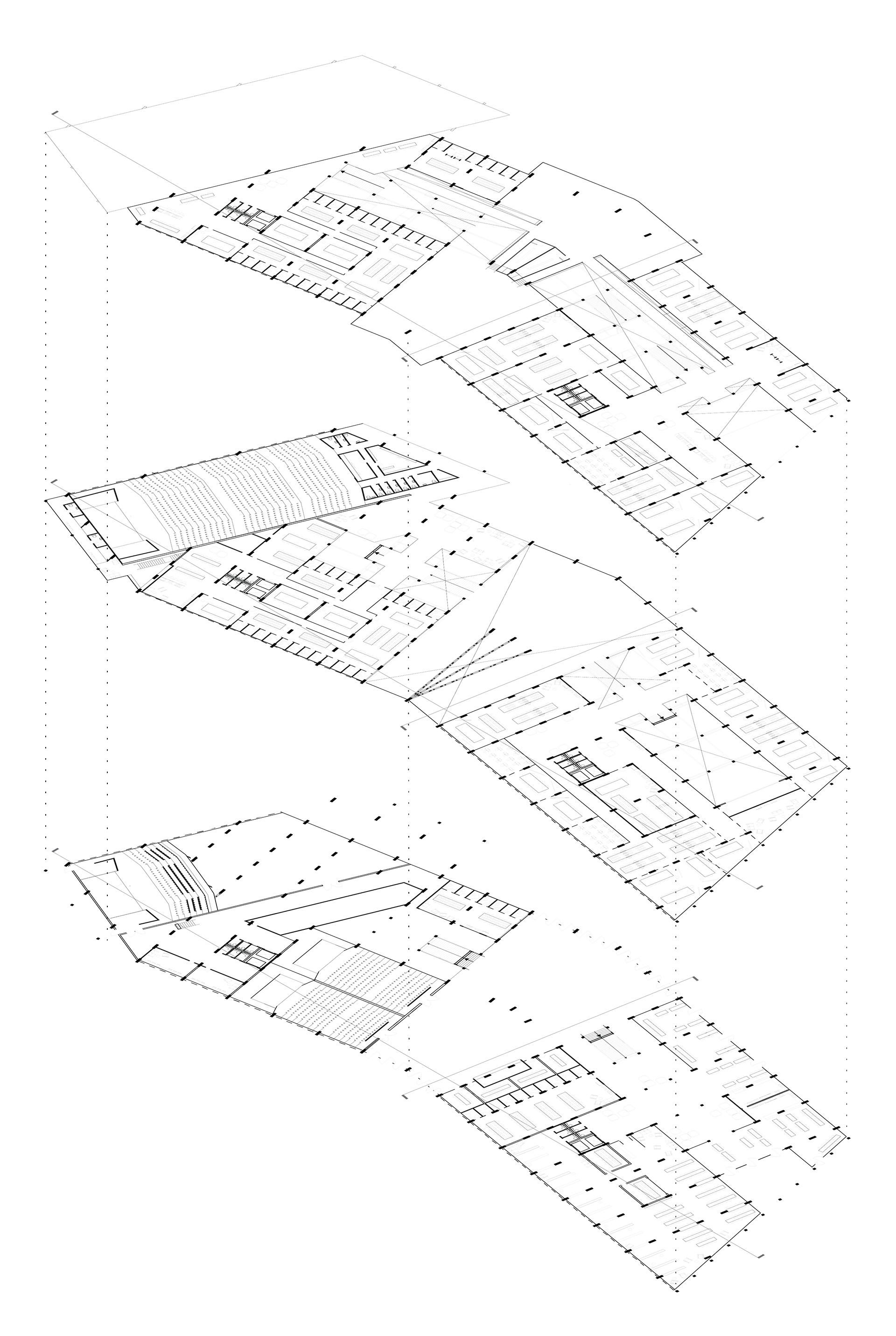 The concept of this creative arts school stemmed from its relationship to the landscape of site. The design responds to the two natural conditions, the forest to the East and the sea to the West. The building navigates the threshold between land and sea. The building hinges at the entrance, folding in towards the hillside and opening out to the sea. A 20˚ grid shift creates enclosure towards the shelter of the forest and opening to the expansiveness of the sea. The structural grid is designed to provide maximum view shafts through the architecture out to the sea. Timber structural elements are designed to be expressed as an exoskeleton. In the large theatre, the spatial alignment contrasts with the structural grid. Calling attention to the mass timber structural elements overhead.