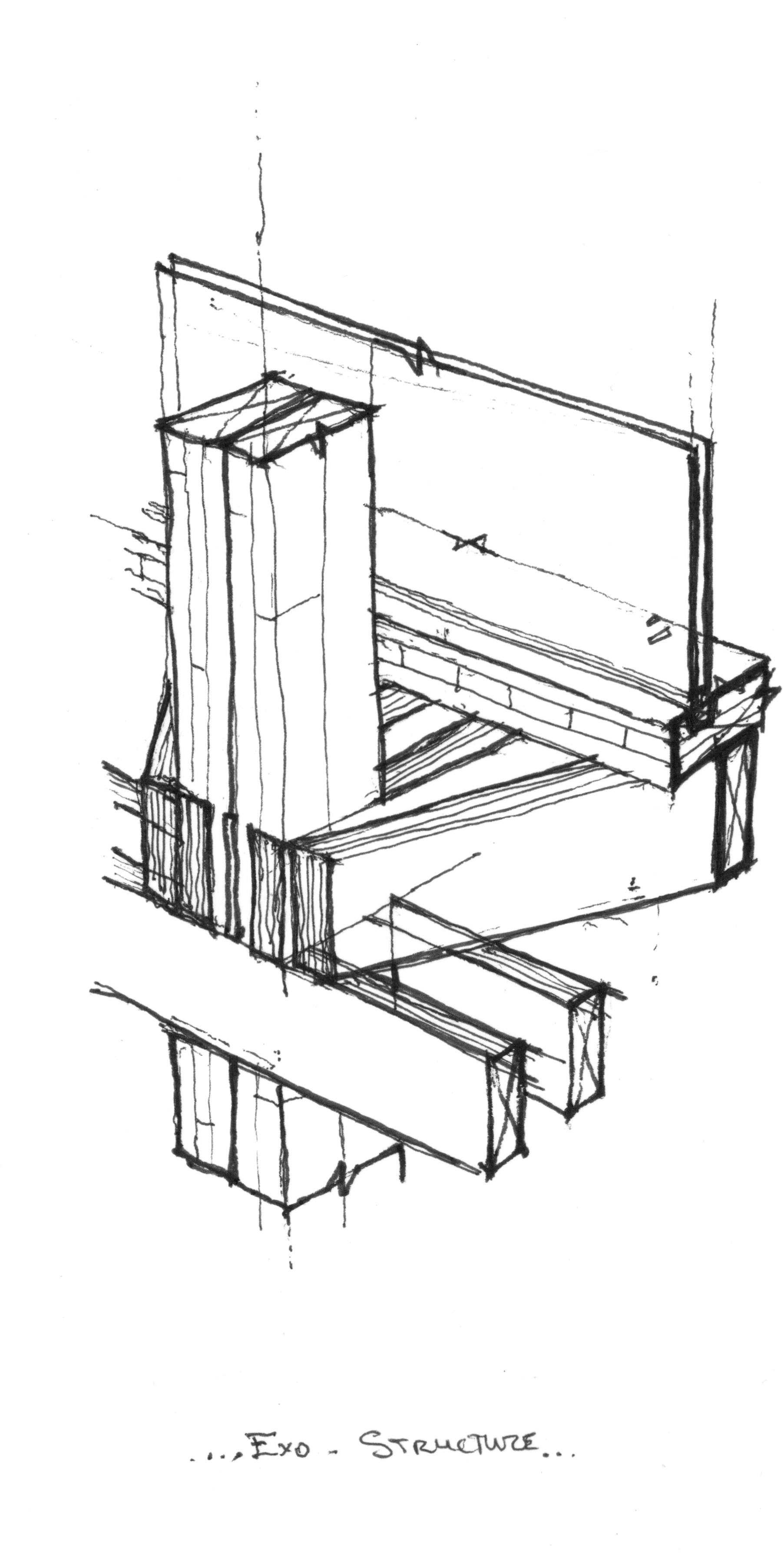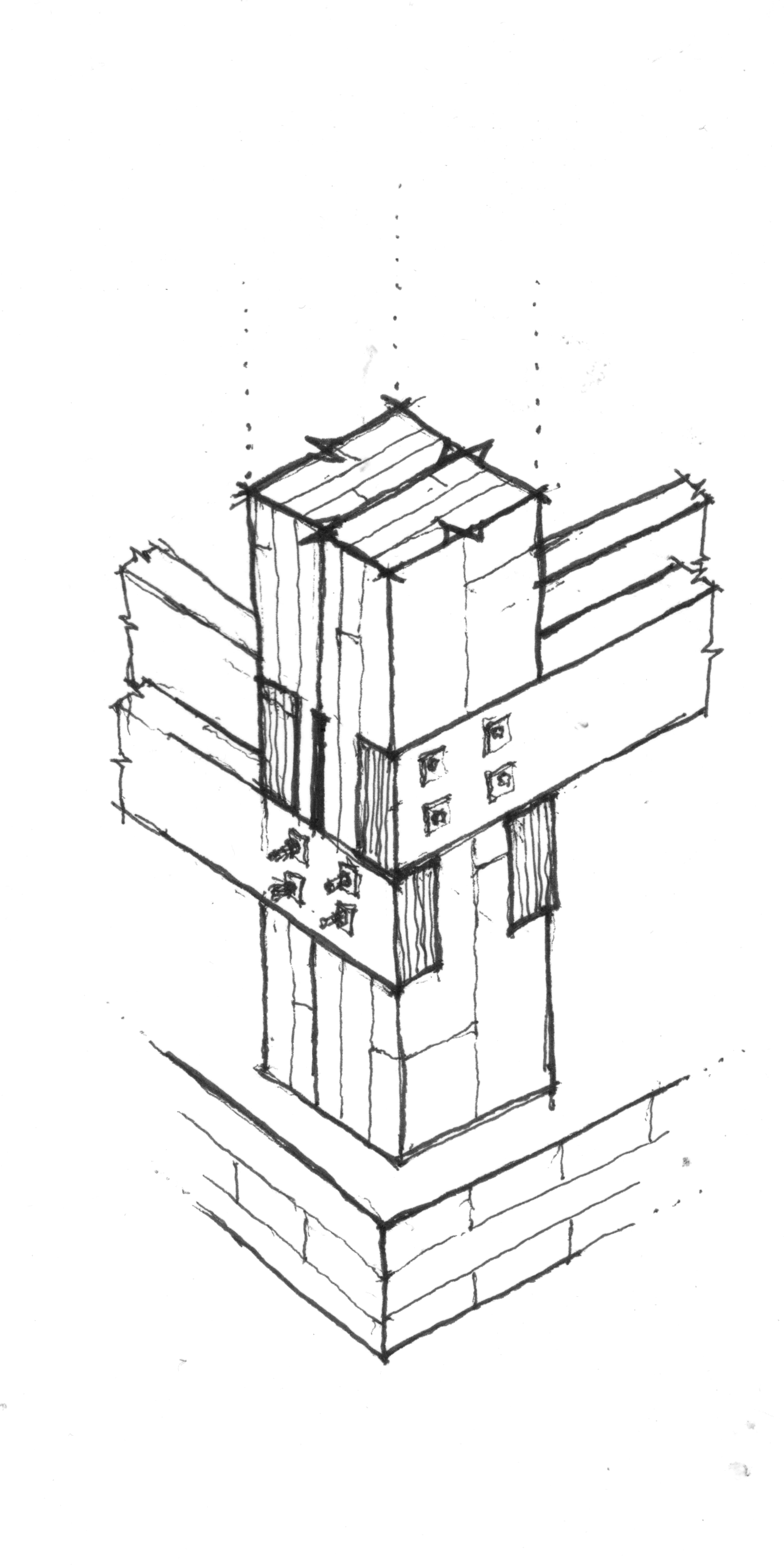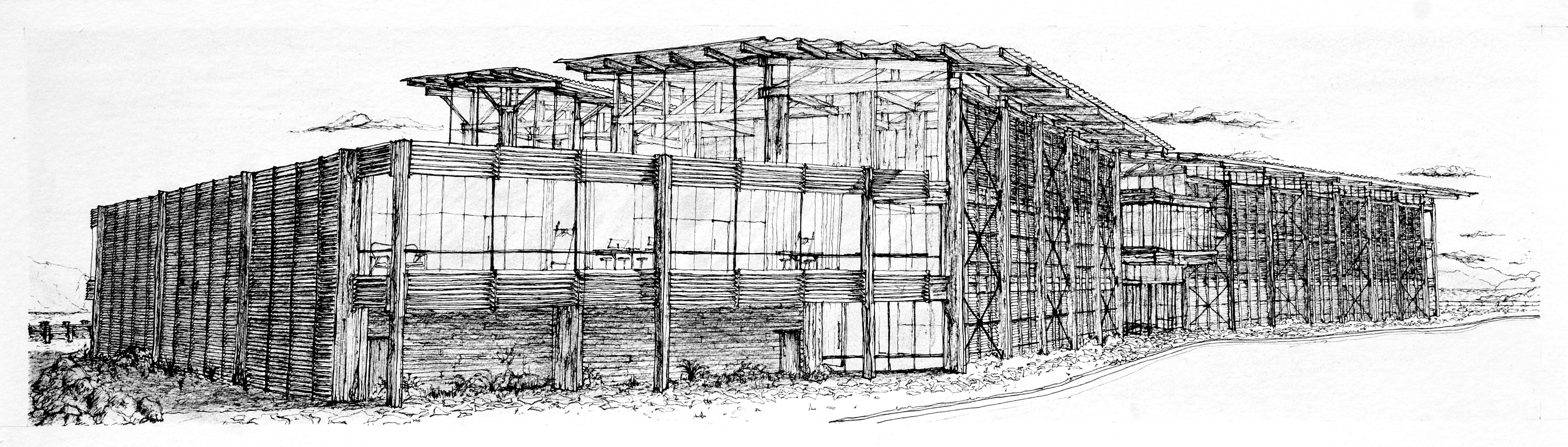 The concept of this creative arts school stemmed from its relationship to the landscape of site. The design responds to the two natural conditions, the forest to the East and the sea to the West. The building navigates the threshold between land and sea. The building hinges at the entrance, folding in towards the hillside and opening out to the sea. A 20˚ grid shift creates enclosure towards the shelter of the forest and opening to the expansiveness of the sea. The structural grid is designed to provide maximum view shafts through the architecture out to the sea. Timber structural elements are designed to be expressed as an exoskeleton. In the large theatre, the spatial alignment contrasts with the structural grid. Calling attention to the mass timber structural elements overhead.