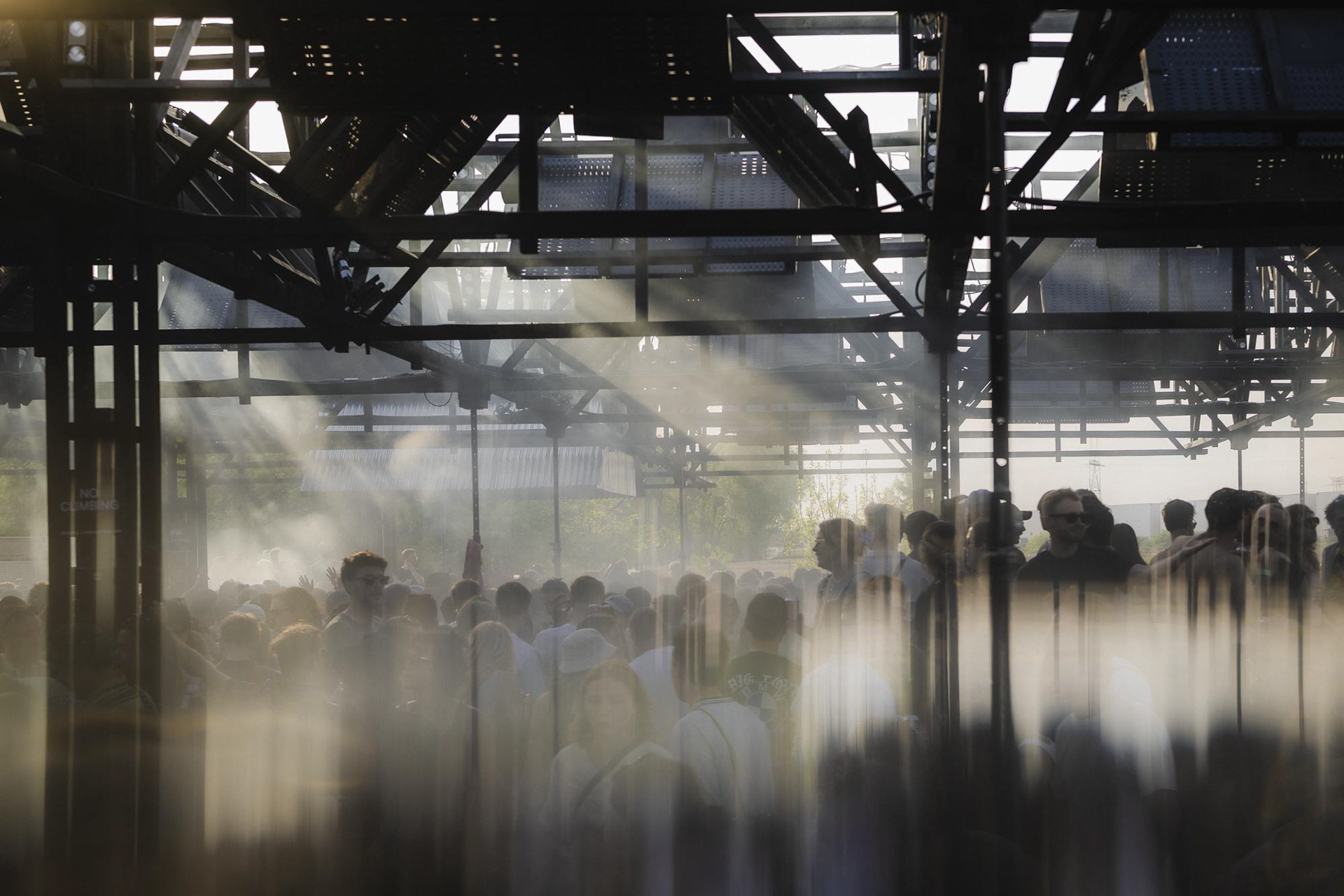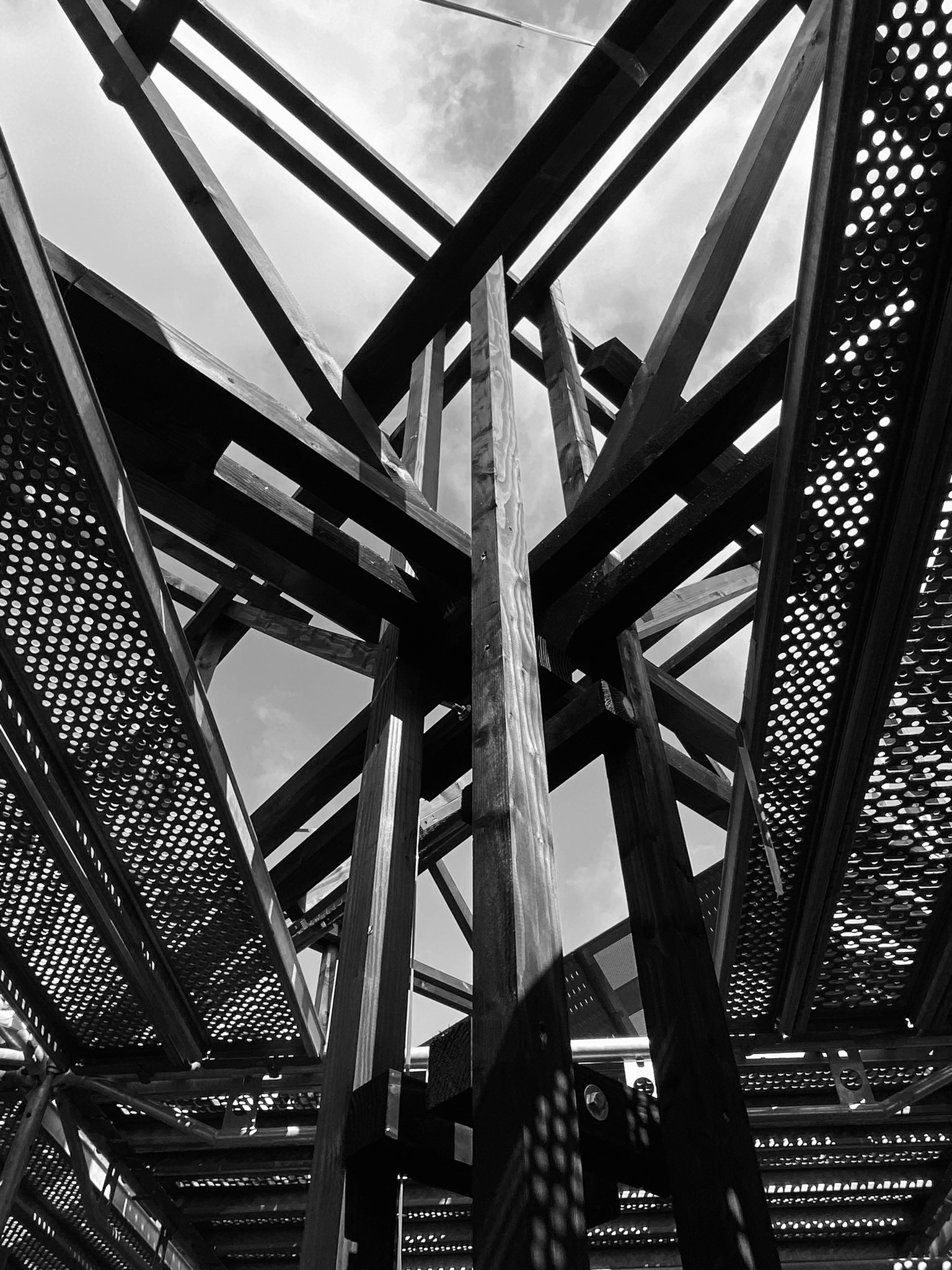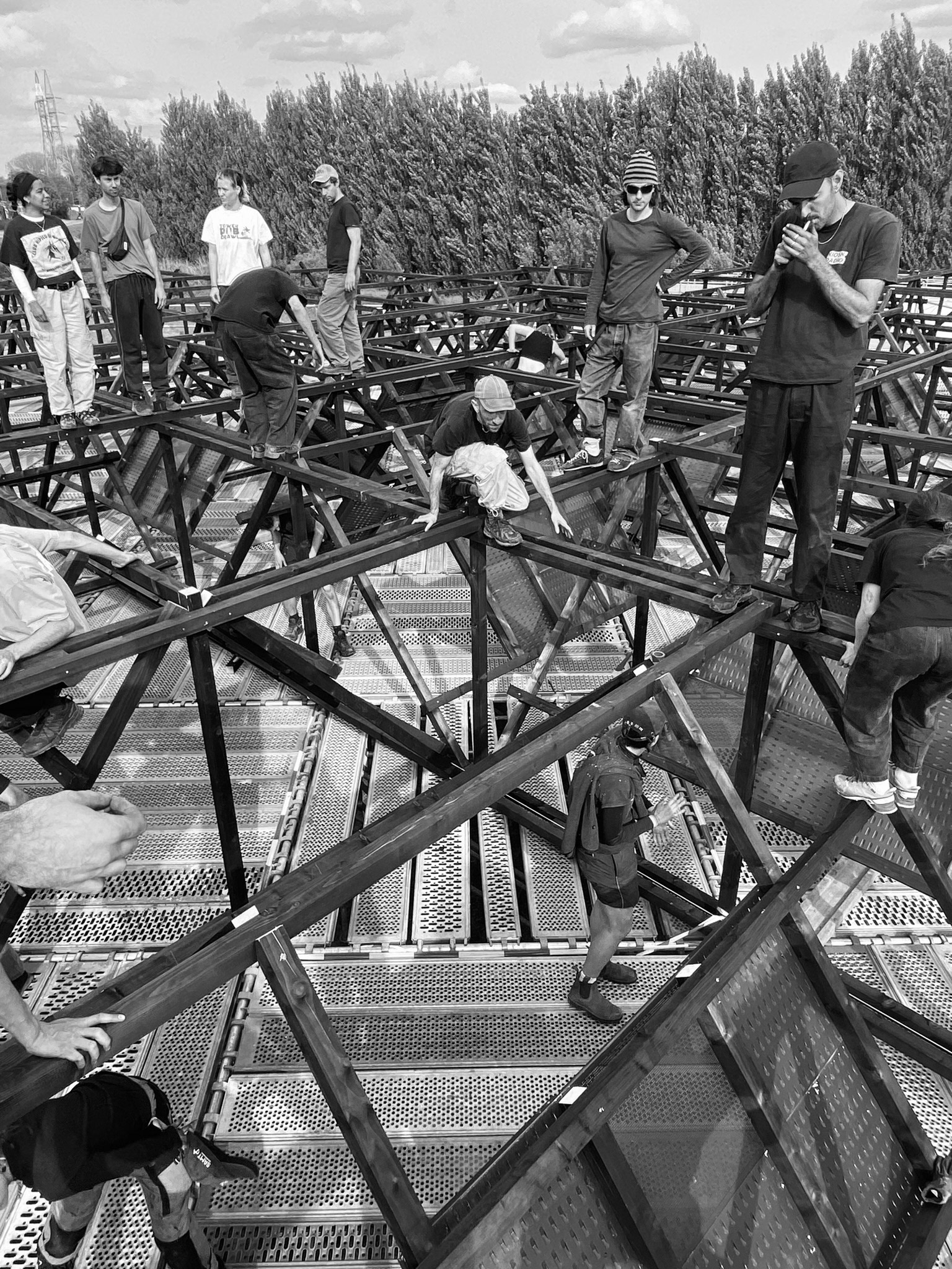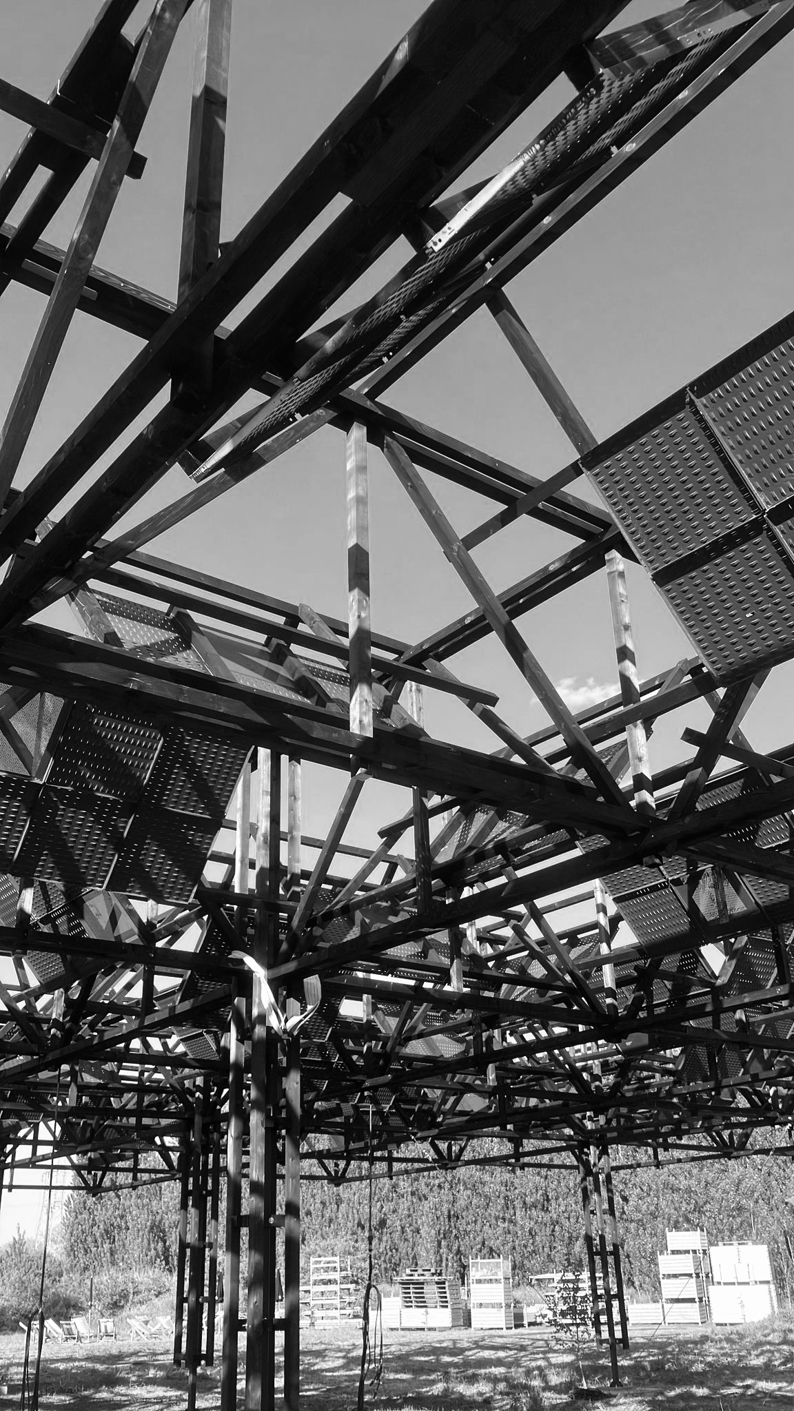 [ Leopold Banchini & Giona Bierens de Haan ] ‘Dark Skies’ is a stage designed and built by Leopold Banchini and Giona Bierens de Haan. The concept is about democratising the experience, space and sound of a DJ set. Achieved by suspending 116 speakers and 58 subwoofers across one thousand square meters of timber trusses, facing the down toward the crowd. The two DJ booths alternate, with an equal sound experience across the dance floor to create a unique and non-linear club experience. In this way, sound becomes a tangible material within the architecture. I worked in a team with the architects to construct this stage for Horst Arts and Music Festival in Asiat Park, Belgium. Aiding in the construction of the roof trusses, reflecting panels, columns, and the wind bracing of this structure.