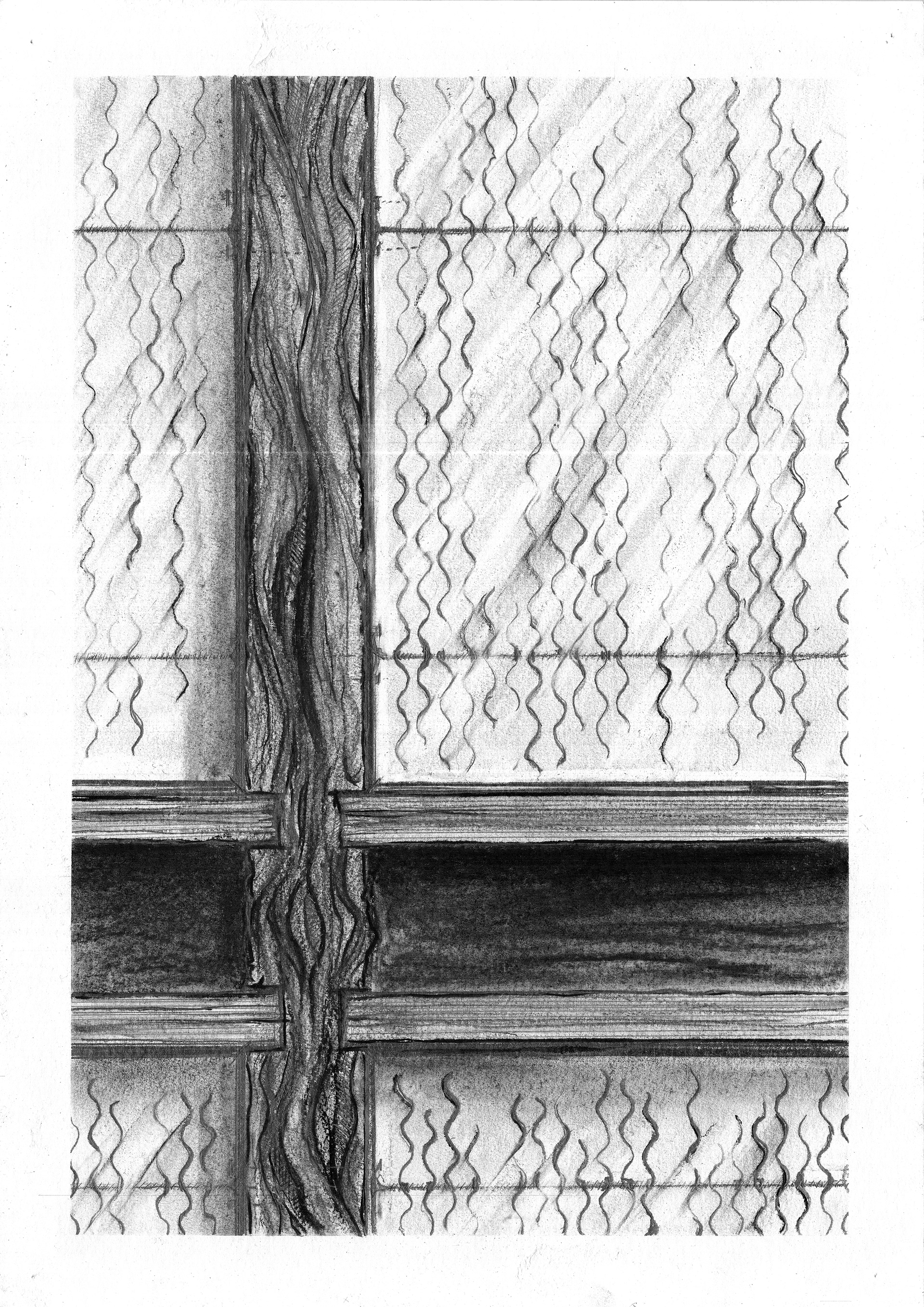 Drawing from the Depot. The Kilbirnie bus depot is slated for demolition. A centenarian building composed primarily of 540 steel trusses, 10,630 square meters of corrugated iron and 339,334 bricks. All destined for landfill at worst, or carbon-intense metal recycling at best. This project highlights the potential of all this old material. Material full of aged, time-worn character. Using this building as an ‘urban mine’, full of resources. The design reuses, relocates and reinterprets the disassembled component parts in Newtown, 2km away. The scheme pulls a roof of housing across to create a covered public space on Riddiford Street. An existing chapel is displayed as an artifact under this canopy. Three new lanes cut back across the currently impermeable block. Analogue drawing is employed to articulate and design with the texture, character and idiosyncrasies in these old materials. Examining the qualitative, architectural and experiential agency in these old materials.